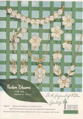 prezzi accessibili. Attraenti e fantasiose, le creazioni di Trifari sono  realizzate in materiali poveri come leghe di metallo, finte gemme di colore, cristalli e perline, brillavano al